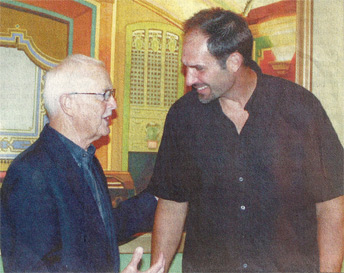 Jazz pianist Bob Hirsch speaks with artist Ken DeWaard after a mural by DeWaard featuring Hirsch was unveiled at the ARTT Encore building on Main Street in Viroqua, Friday night. Photo by Angie Cina