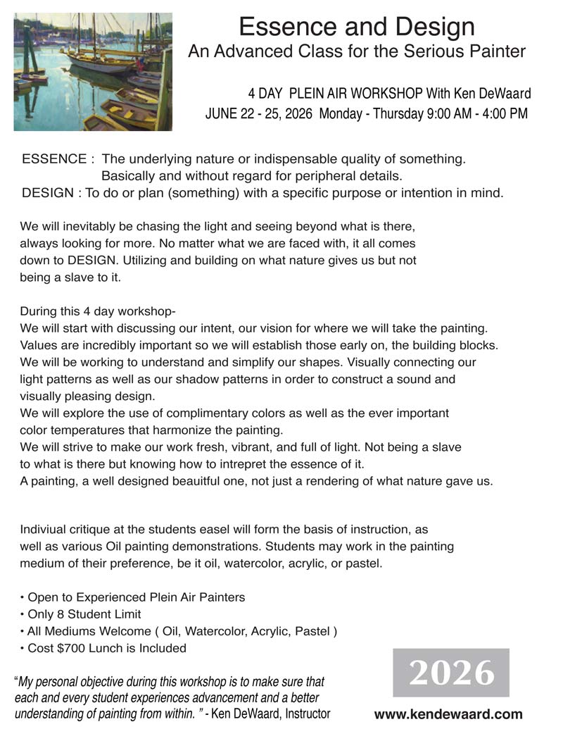 There are only 8 spots available for this Advanced Plein Air Workshop. I will require that you have been working in plein air, this is not a beginners class. I will handle all inquiries based on first come first serve. A deposit check of $250 received will hold your spot. Lunch is Included After Hours Critique - You can also bring up to 4 pieces, in progress or completed, that you would like to receive a critique on. Any deposit checks will not be cashed until a month before the start of the class. I would appreciate a two week notice of any cancellations. This class will be held in the mid coast area ME.